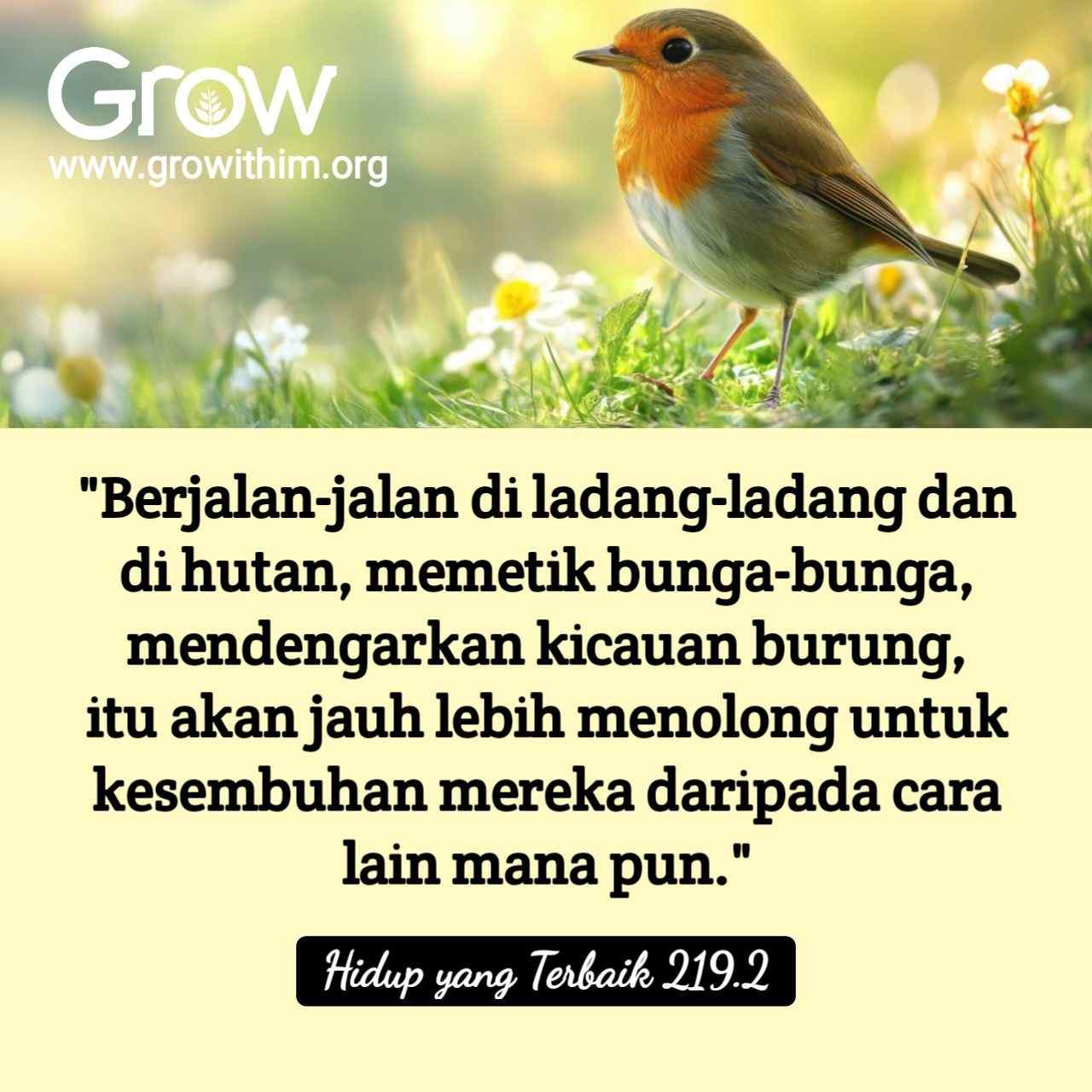 “Bagi mereka yang mengalami keletihan otak dan saraf karena bekerja terus menerus di tempat yang tertutup, jalan-jalan keluar kota di mana mereka bisa hidup sederhana, hidup santai, berhubungan akrab dengan benda-benda alam, itu akan sangat menolong. Berjalan-jalan di ladang-ladang dan di hutan, memetik bunga-bunga, mendengarkan kicauan burung, itu akan jauh lebih menolong untuk kesembuhan mereka daripada cara lain mana pun.”