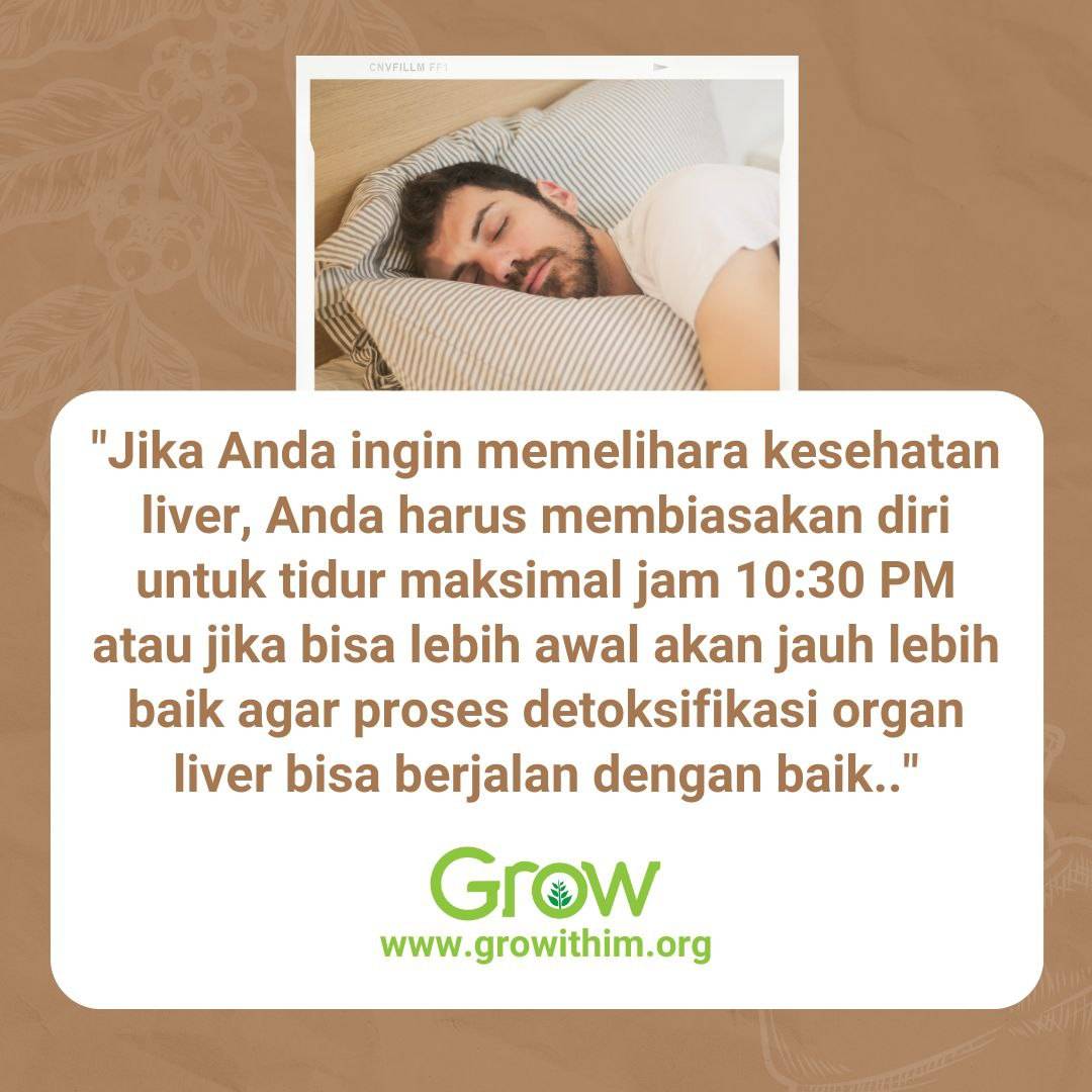 Jadi kalau kita tidur di atas jam 12 malam maka bisa dikatakan proses detoksifikasi liver kita tidak akan berlangsung dengan baik. “Lebih dari satu per tiga orang dewasa Amerika tidak memenuhi rekomendasi tidur tujuh sampai delapan jam setiap malam, yang tanpa disadari ikut berkontribusi dalam peningkatan kasus penyakit perlemakan hati non-alkoholik” (https://globalliver.org/how-does-sleep-affect-fatty-liver-disease-nash-news/#:~:text=Sleep%20Deprivation:%20A%20Silent%20Trigger,sleep%20to%20maintain%20liver%20health.)