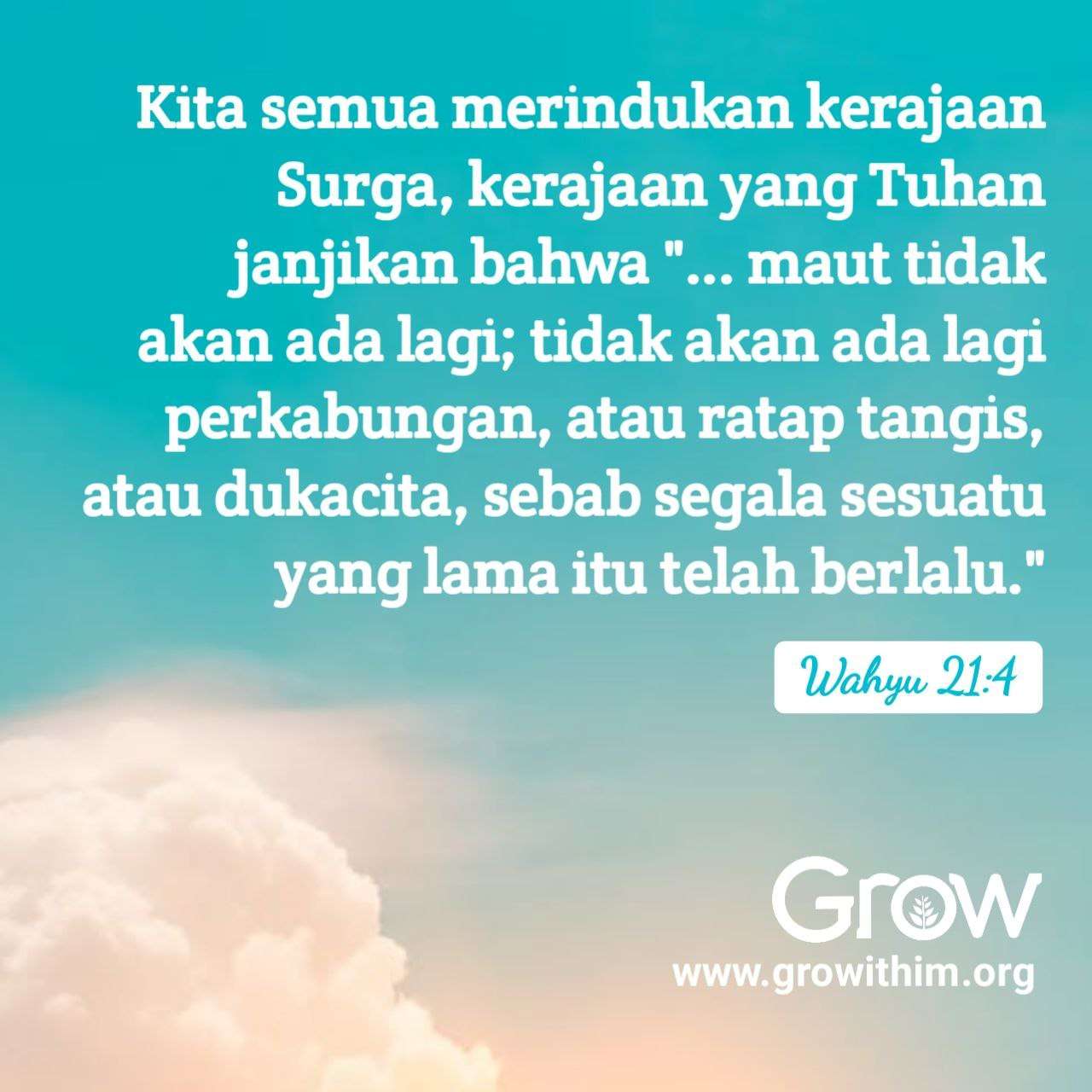 Saat ini dunia kita penuh dengan ketidakadilan, penderitaan, sakit penyakit, dan berbagai macam hal yang tidak baik. Oleh karena itu, kita semua merindukan kerajaan Surga, kerajaan yang Tuhan janjikan bahwa “… maut tidak akan ada lagi; tidak akan ada lagi perkabungan, atau ratap tangis, atau dukacita, sebab segala sesuatu yang lama itu telah berlalu.” (Wahyu 21:4)