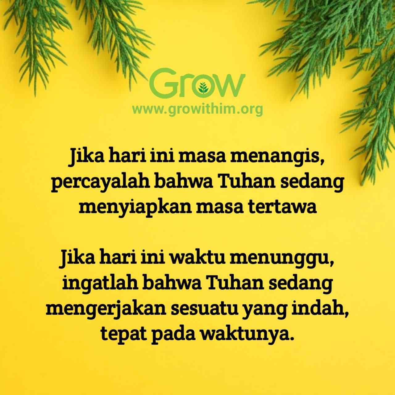 Jika hari ini adalah masa menangis, percayalah bahwa Tuhan sedang menyiapkan masa tertawa. Jika hari ini adalah waktu menunggu, ingatlah bahwa Tuhan sedang mengerjakan sesuatu yang indah, tepat pada waktunya.